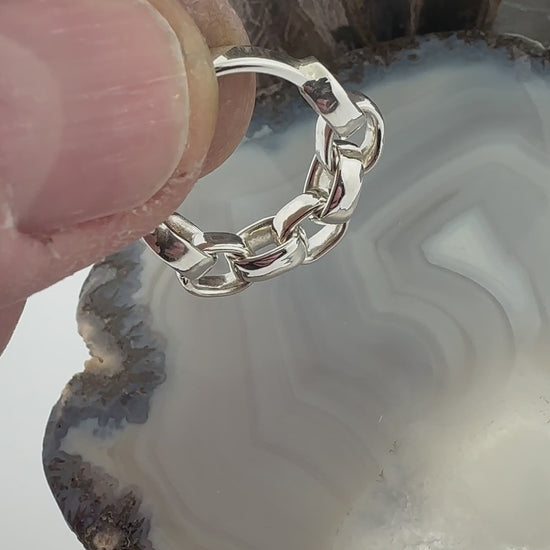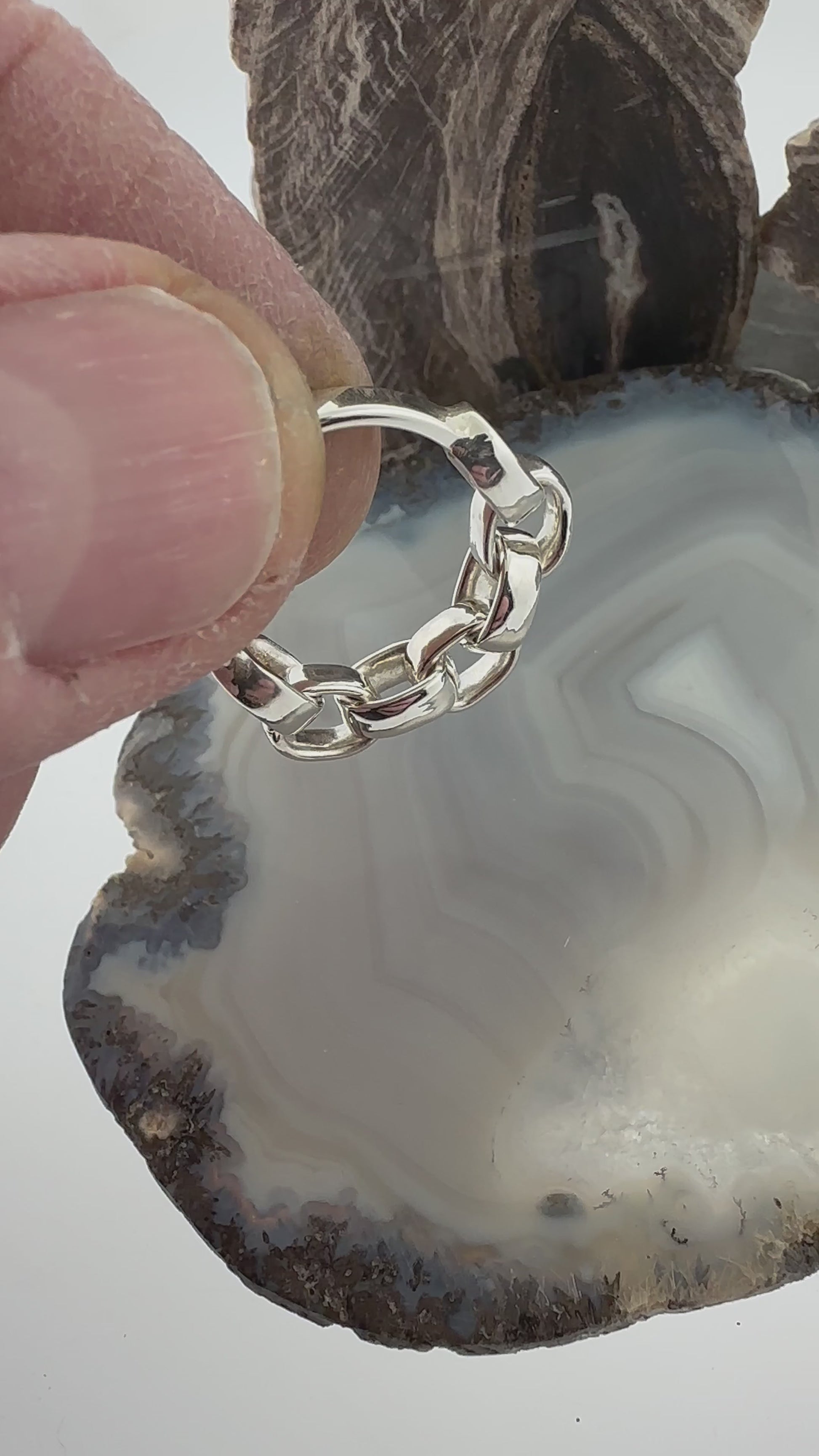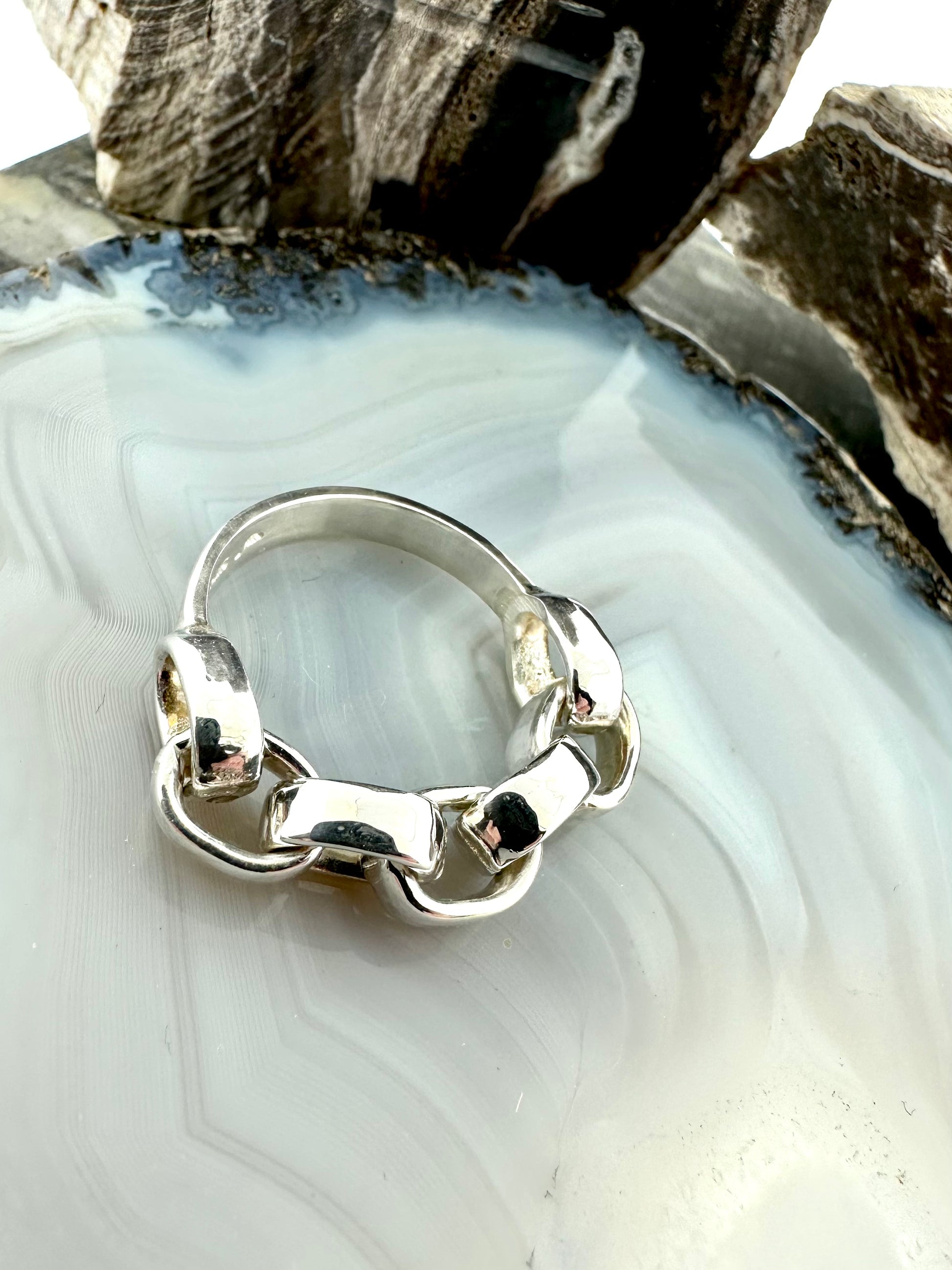 Crafted from sterling silver, this size 8 ring features interlocking chain links that wrap smoothly around the finger — a perfect balance of strength and style. Whether worn alone or stacked with others, it makes a confident statement that’s both timeless and modern.